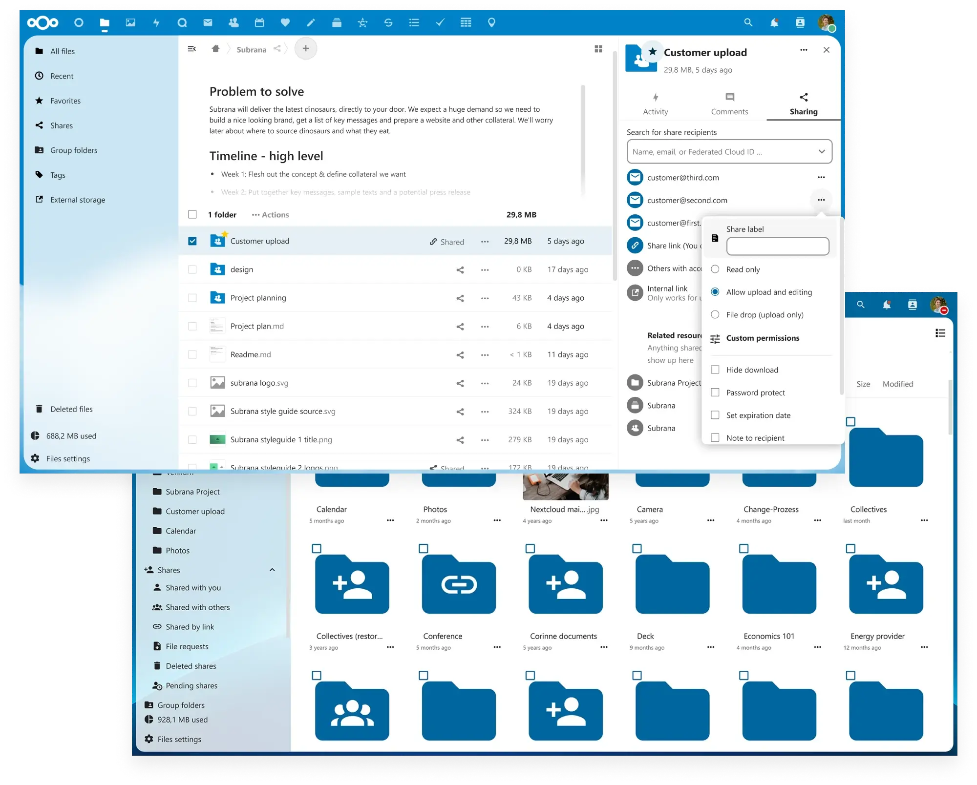 Nextcloud offers a modern and convenient web interface, desktop clients and mobile apps, enabling collaborative work with files from any device and location. The system includes built-in access control based on rules, robust password policies with brute-force protection, and other security features.