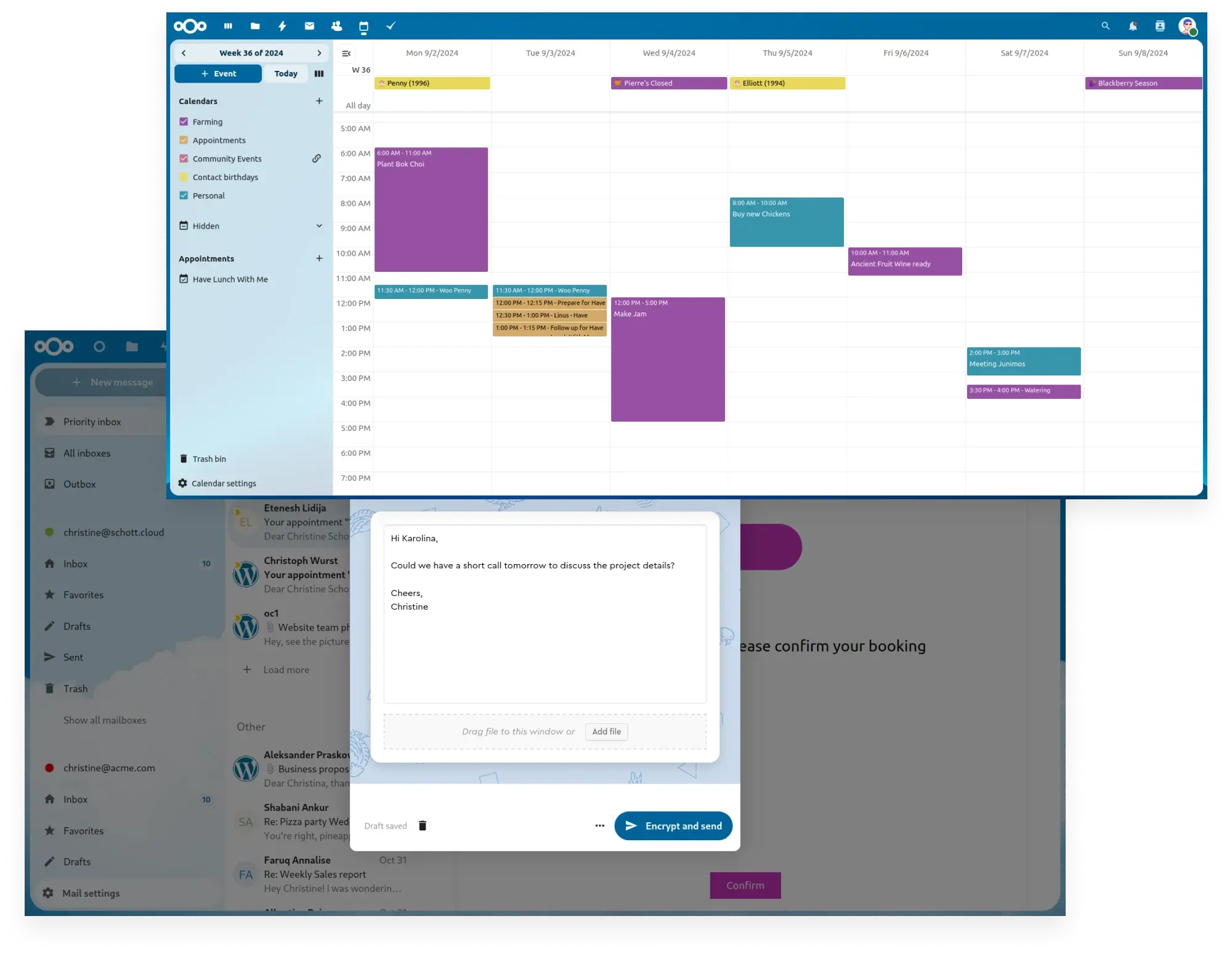 Nextcloud Groupware offers a modern, easy-to-use web interface with no distracting ads, increasing user focus and productivity. Integrations are available for iOS, Android, macOS, Windows and Linux, and compatibility with popular mail clients such as Thunderbird is provided.